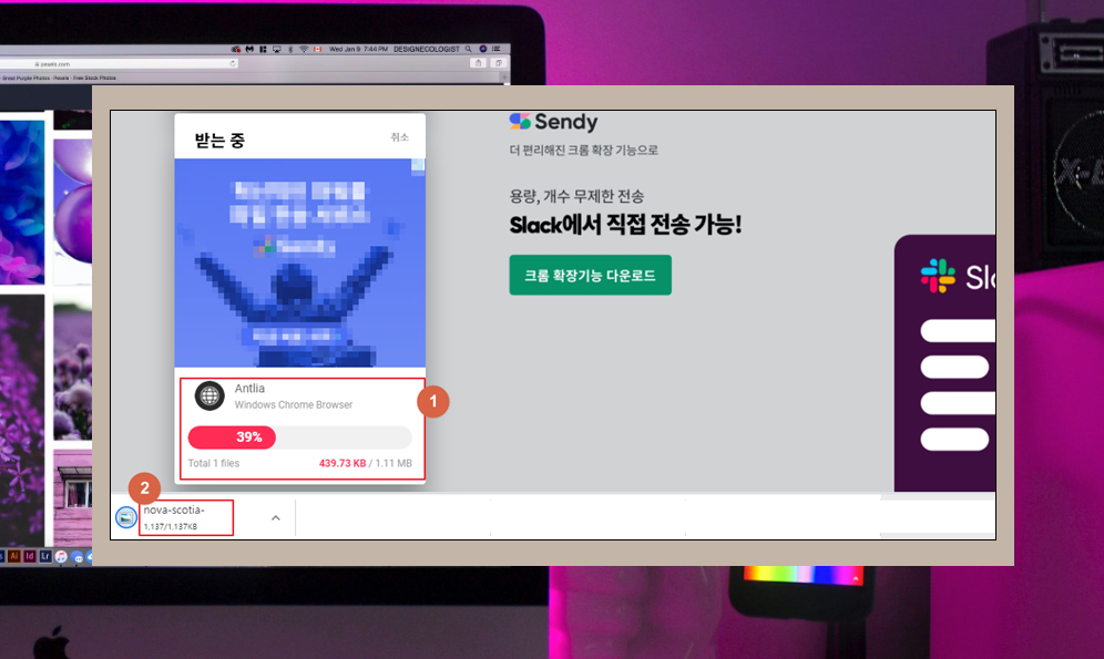 7. 전송되는 속도는 꽤 빠른 편입니다. 본인이 사용하는 인터넷 회선의 속도가 빠를 수록 대용량 파일을 보내는 시간이 단축될 수 있습니다. 진행 과정이 100%가 되면 인터넷 브라우저의 다운로드 폴더에서 해당 파일이 저장되어 있는 것을 확인할 수 있습니다.