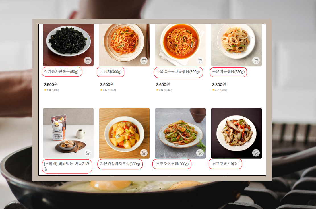 이럴 때에는 제가 알려드린 방식을 통해 사람들이 좋아하는 요리 종류를 쉽게 알아볼 수 있는데요. 간단히 몇 가지 종류만 찾아볼게요. 참기름자반볶음, 무생채, 콩나물 볶음, 어묵 볶음, 반숙계란장, 간장감자조림, 오이무침, 건표고버섯볶음을 찾았어요.