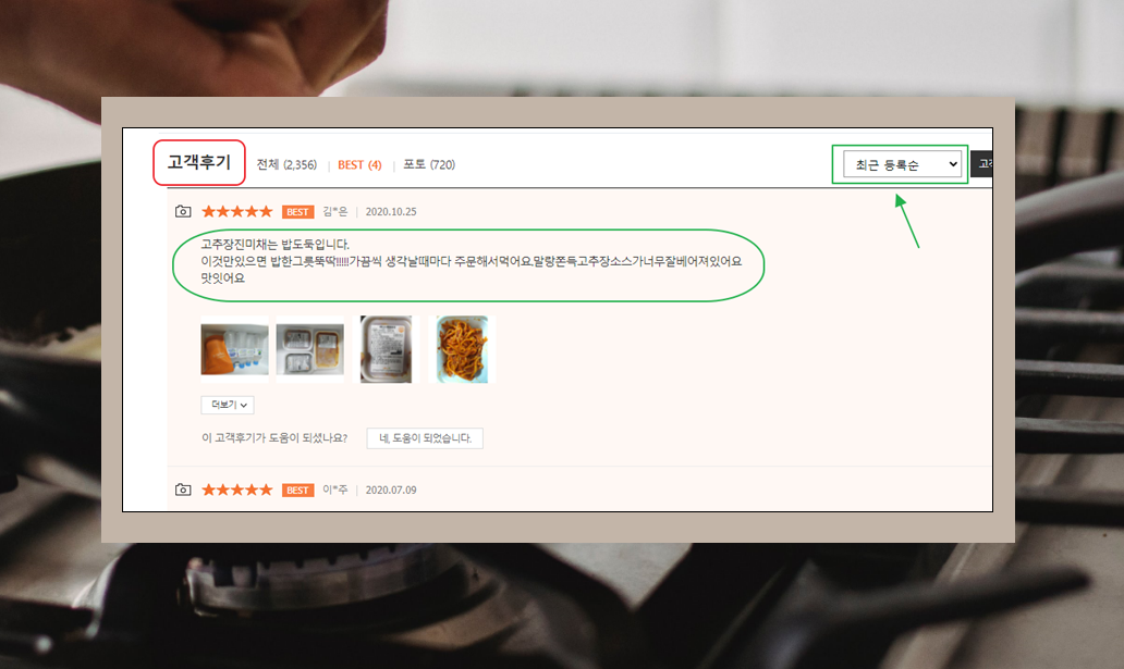 7. 더 아래로 화면 스크롤을 내리면 후기를 읽어볼 수 있는데요. 우리가 찾은 반찬에 대하여 사람들이 얼마나 좋아하는지 살펴볼 수 있어요. 이런 식으로 반찬 종류50가지 이상을 살펴보고, 그 중에서 마음에 드는 요리에 대한 정보를 찾아볼 수 있는데요. 요리할 시간이 부족한 경우에는 사이트에서 몇 가지 구매해보는 것도 도움이 될 거에요.