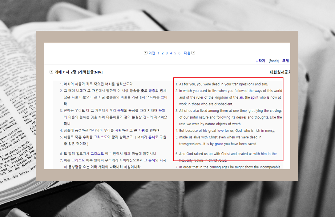 6. 개역한글 버전으로 에베소서 1장을 선택해 보았습니다. 온라인으로 성경을 읽을 때 글씨가 작아서 읽기 어려운 경우가 있을 수 있습니다.