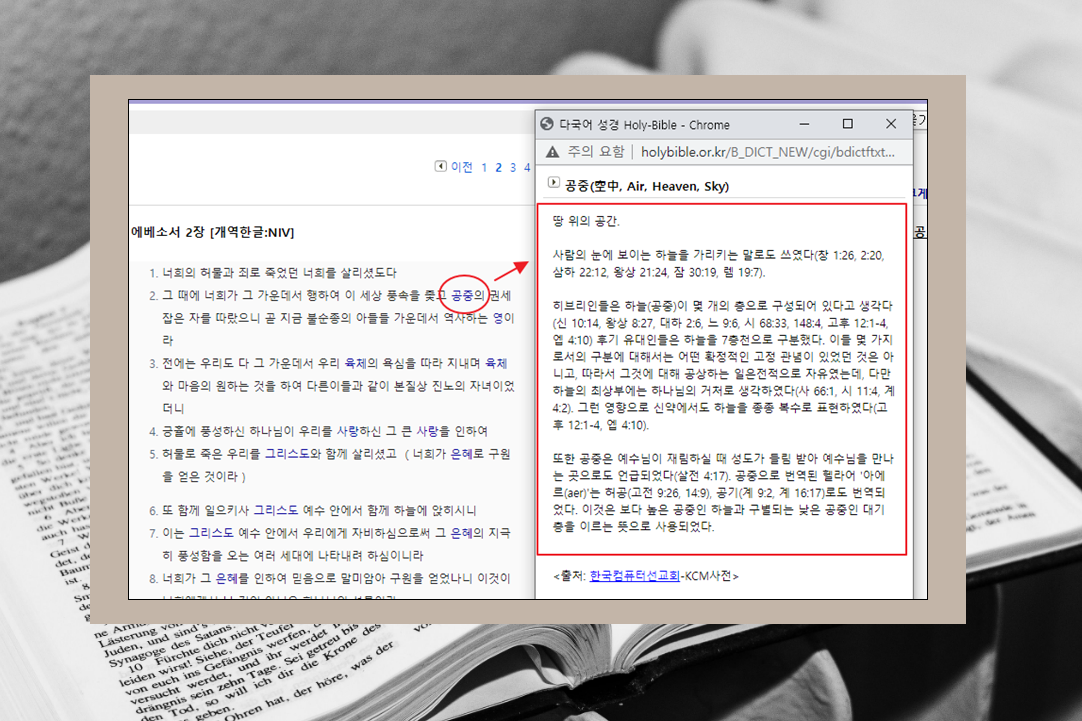 8. 글을 읽다가 모르는 단어가 있을 수 있습니다. 종교적으로 어떤 의미를 담고 있는지 알기 어려운 단어가 있을 수 있는데요. 그런 경우에는 성경에 관련된 온라인 사전을 찾아보면 됩니다. 사이트에서 파란색 글씨로 된 단어를 클릭해 보세요. 그럼 창이 하나 나타나는데요. 새롭게 나타난 창을 통해 사전 내용을 확인할 수 있습니다.