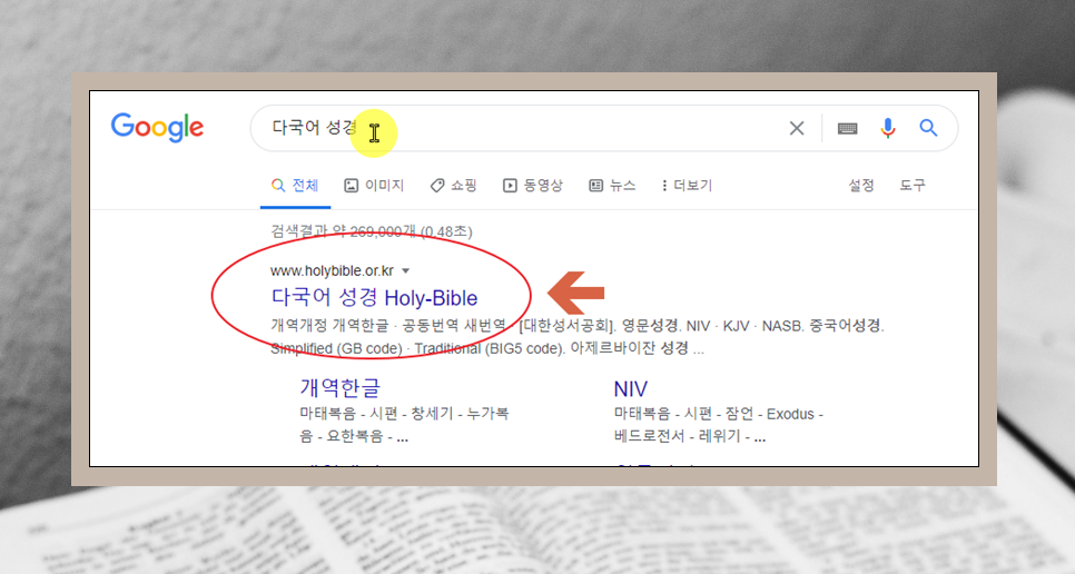 영어로도 성경읽기를 하고 싶을 때가 있는데요. 그런 경우에는 사이트 상단에 있는 대역에서 NIV, KJV, NASB 중에 하나를 클릭해 보세요.