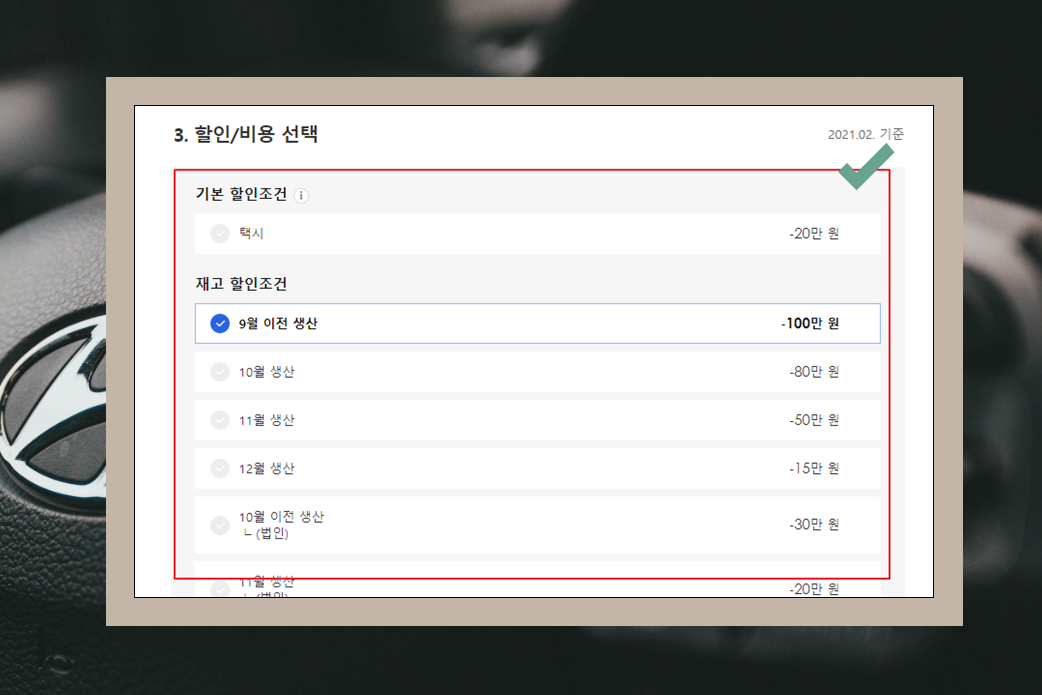 기본적으로 신차를 사려고 할 때, 현대에서 제공하는 "이달의 판매조건"을 반드시 확인해보는 것이 좋습니다. 이것은 차량을 일반 가격보다 저렴하게 구매할 수 있는 기회를 제공하기 때문인데요. 간단하게 알아볼 수 있습니다. 그리고 구입혜택을 반영하여 최종 구매 비용을 알아서 계산해주는 서비스를 이용해 보세요. 정말 편리해요.
