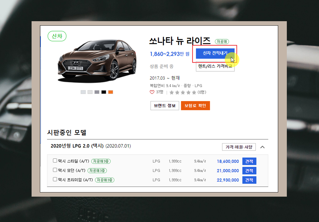 6. 구입혜택을 보고 마음에 드는 차량이 있다면 마우스로 클릭해 보세요. 그럼 이달의 구입혜택을 적용한 가격표를 확인할 수 있는데요. "신차 견적내기" 서비스를 이용하면 돼요.