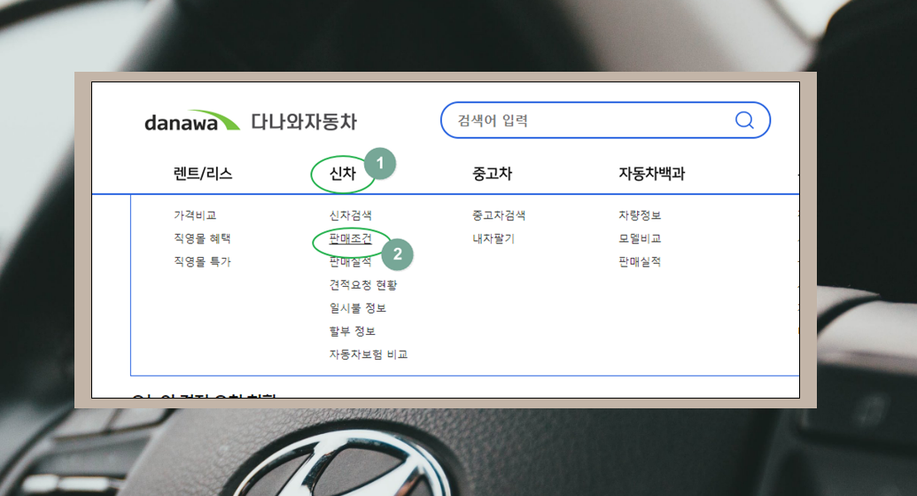 2. 다나와 자동차 홈페이지에 접속했어요. 이곳에서는 렌트, 리스, 신차, 중고차 가격을 알아볼 수 있는 서비스를 제공하고 있는데요. 메뉴에서 신차를 클릭해 보세요. 그럼 이달의 "판매조건" 서비스가 나타나요.