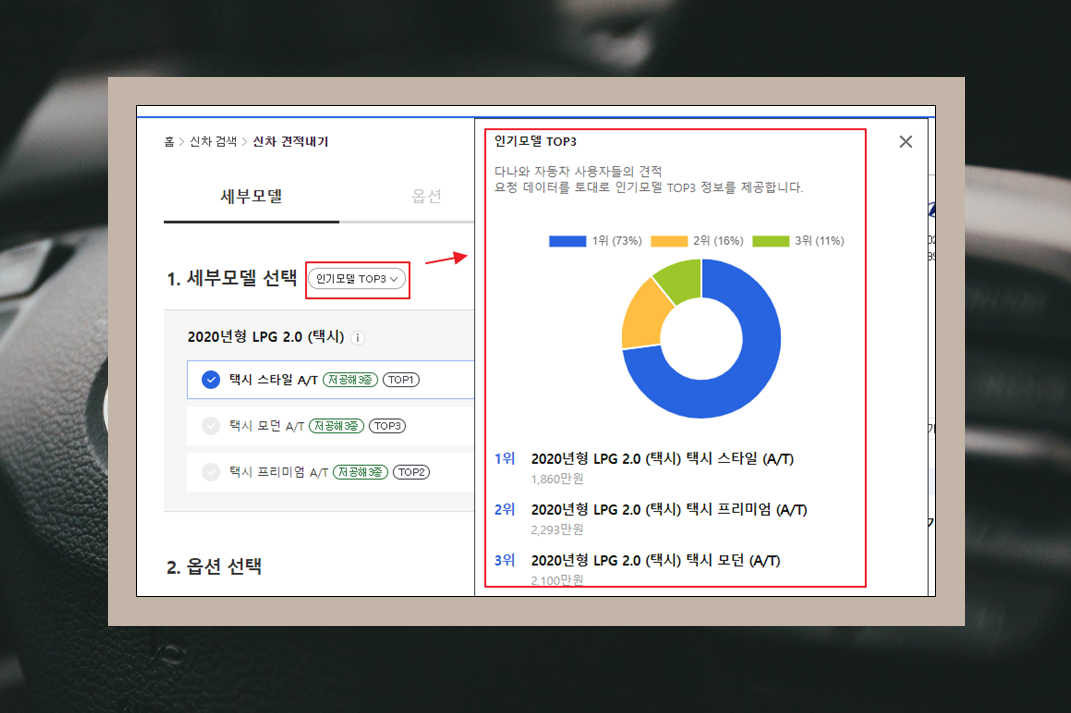 7. 몇 가지 조건을 선택해야 하는데요. 사람마다 원하는 조건이 다르기 때문이에요. 같은 현대자동차를 구매하는 경우라도 세부모델, 옵션, 이용할 수 있는 판매조건에 따라 구매하는 비용이 달라요. 세부모델과 옵션을 선택해 주세요.