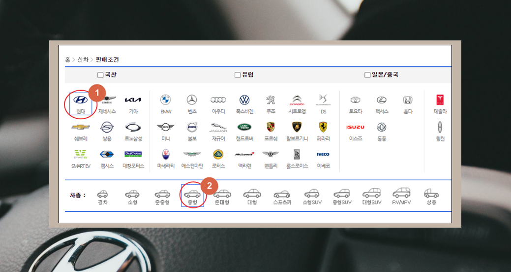 3. 새롭게 열린 페이지에서 국산차 카테고리에 있는 현대자동차 마크를 선택해 주세요. 본인이 관심 있는 차종을 선택하면 되는데요. 경차, 소형, 준중형, 중형, 준대형, 대형, 스포츠카, SUV 시리즈 등 여러 가지 차종 선택이 가능해요.