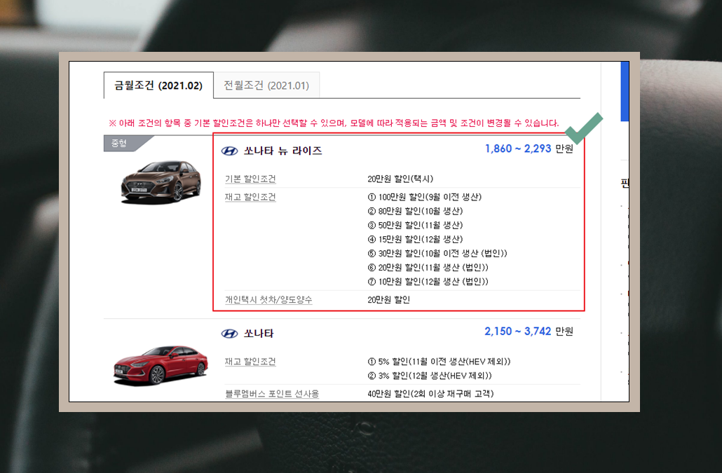 5. 이달의 구입혜택과 더불어 전월조건 확인도 가능한데요. 이달에 어떤 부분이 추가되었는지 알아볼 때 유용해요. 같은 현대자동차의 모델이라고 하여도 특정 모델에 대하여 이달의 판매조건이 후한 경우가 있어요. 이러한 부분을 잘 활용하면 효과적인 소비를 할 수 있죠.