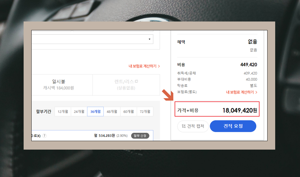 몇 가지를 선택한 후 사이트 우측 아래를 보면 최종 가격을 확인할 수 있어요. 이달에 직접 현대자동차를 구매하는 경우 구입혜택 적용을 포함하여 최종적으로 얼마에 구매할 수 있는지 알 수 있어요. 실제로 살 때 발생하는 금액과 거의 차이 없을 거에요.