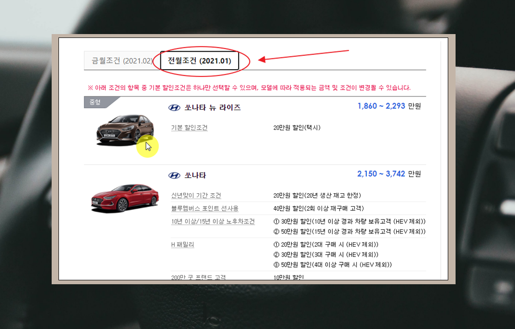 5. 이달의 구입혜택과 더불어 전월조건 확인도 가능한데요. 이달에 어떤 부분이 추가되었는지 알아볼 때 유용해요. 같은 현대자동차의 모델이라고 하여도 특정 모델에 대하여 이달의 판매조건이 후한 경우가 있어요. 이러한 부분을 잘 활용하면 효과적인 소비를 할 수 있죠.
