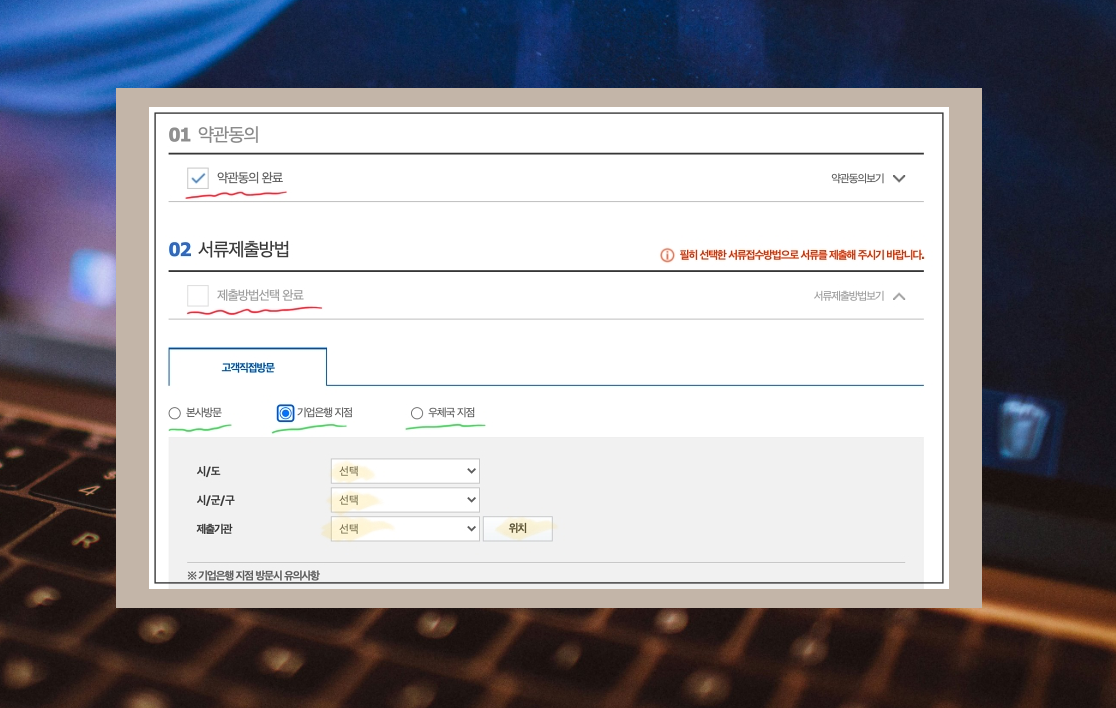 7. 여기서 신청하는 과정은 간단해요. 일단 여기서 안내하는 약관을 읽어보고, 동의를 해주셔야 해요. 약관 동의 이후에는 서류를 제출할 기관을 선택해야 해요. 우체국과 기업은행 지점을 선택할 수 있어요. 보건복지전용의 경우에는 해당 기관으로 되어 있을 거에요.