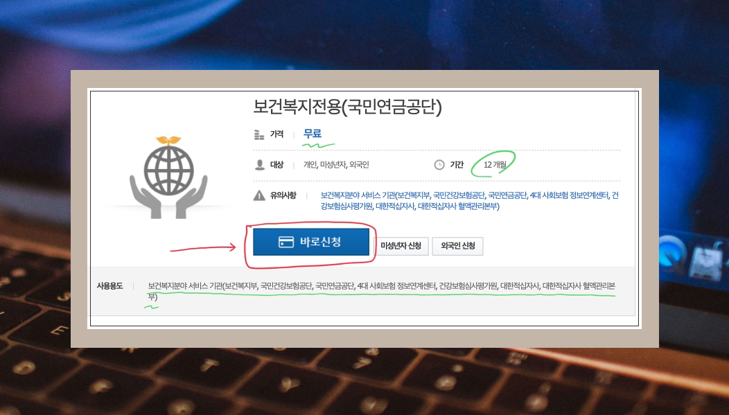 6. 보건복지전용의 경우 무료로 사용할 수 있어요. 사용용도 안내를 보고, 여기에 해당하는 인터넷 업무만 보는 경우에 보건복지전용 상품을 발급 받는 것이 나아요. 바로 신청 버튼을 누르면 진행할 수 있어요.