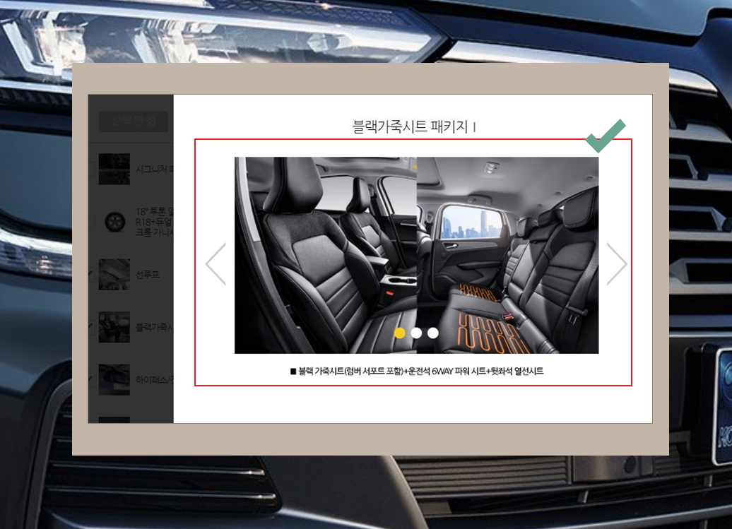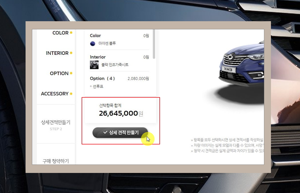 7. 이번에는 자동차에 들어가는 옵셥을 선택할 차례인데요. 르노삼성 자동차에 들어가는 옵션과 해당 옵션에 대한 가격표가 보이네요. 자신에게 필요하다고 생각하는 것을 선택하면 돼요.