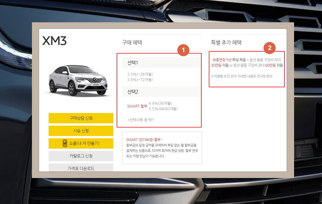 11. 구매혜택의 경우에는 르노삼성(제조사)에서 제공하는 여러 혜택을 말하는 거에요. 보증연장이나 옵션 및 용품 구입비를 일정 금액 지원 받을 수 있다고 하네요.