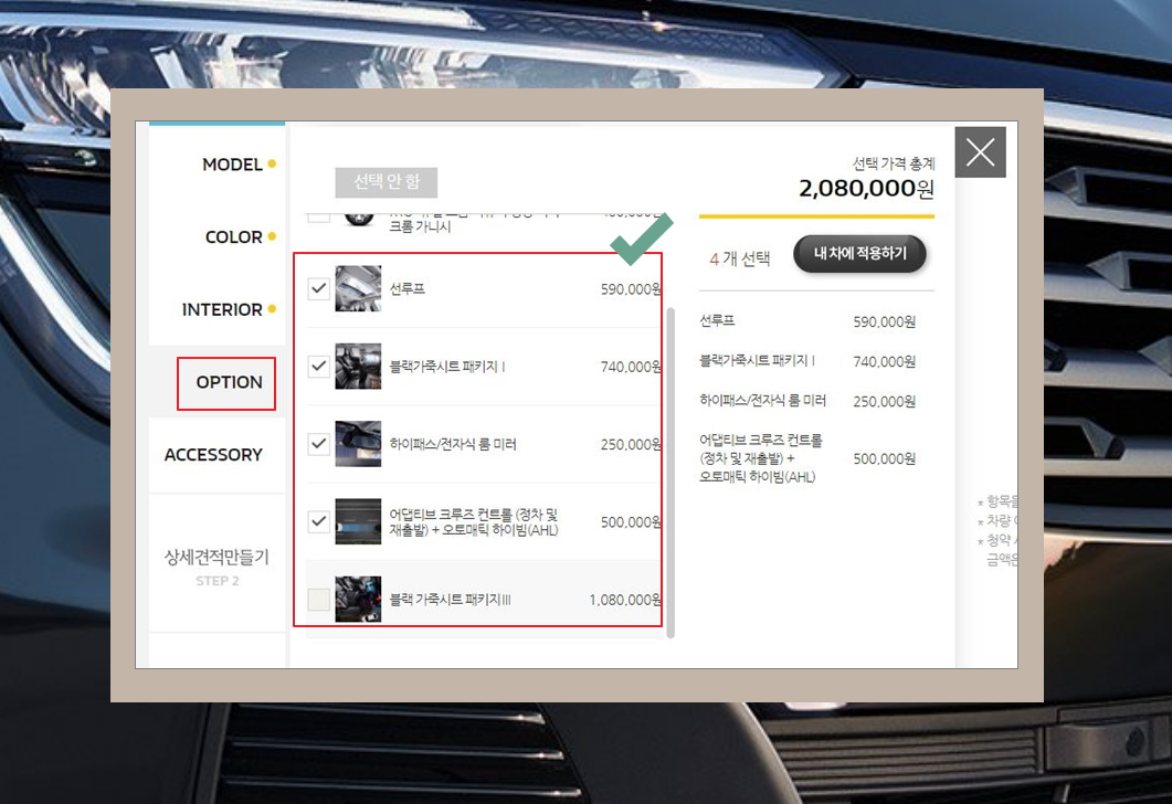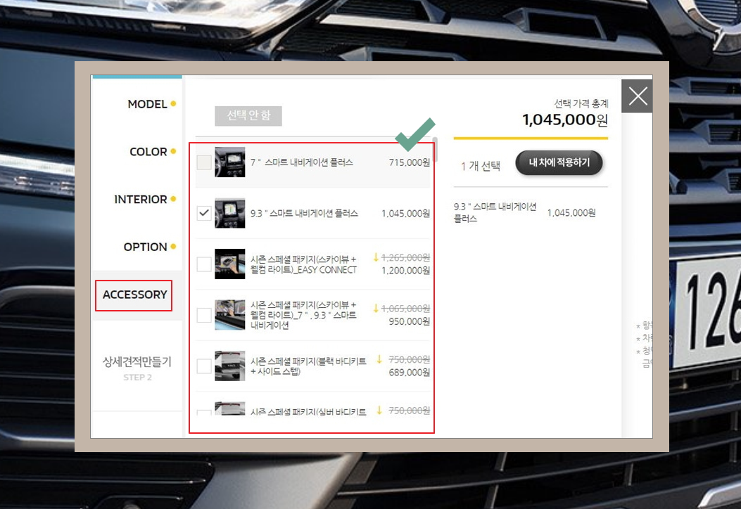 8. 이 밖에도 악세사리 부분을 선택해야 하는 데요. 아무래도 내비게이션은 크기가 크면 클수록 좋아요. 꼭 필요한 것을 선택한 후 "내 차에 적용하기"를 눌러보세요.