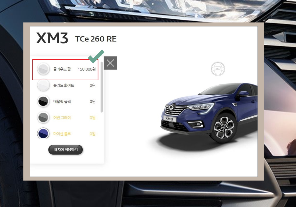 4. 저는 작으면서 다용도로 사용할 수 있는 자동차인 XM3를 선택했어요. 같은 브랜드의 같은 모델을 구입하는 경우라도 선택한 세부등급이나 옵션 등에 따라 구입 비용이 달라질 수 있는데요. 여기서는 그러한 조건들을 반영한 신차가격표를 받아볼 수 있어요. 그럼 세부 모델 중 하나를 선택해 볼게요.