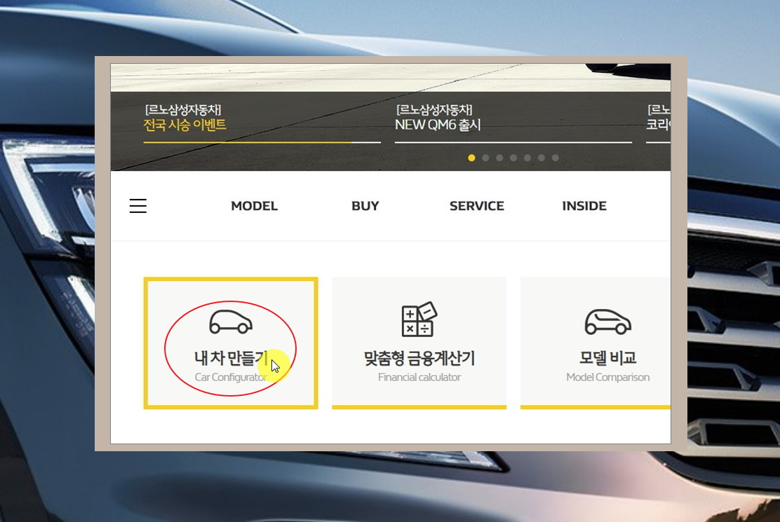 2. 르노삼성자동차 공식 홈페이지에 접속했어요. 메인화면에서 좌측을 보면 [내 차 만들기] 버튼이 있는데요. 해당 버튼을 클릭해 주세요.