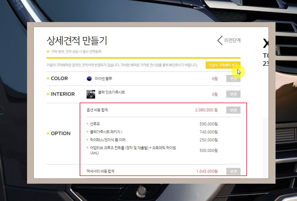 9. 세부 등급, 옵션, 인테리어 등을 입력한 결과 최종 구매 비용이 산출되었어요. 대리점에 따라 할인 혜택을 달리하는 경우가 있는데요. 우리가 방금 구한 신차가격표는 대리점 혜택을 제외한 나머지 금액이라고 보시면 돼요.