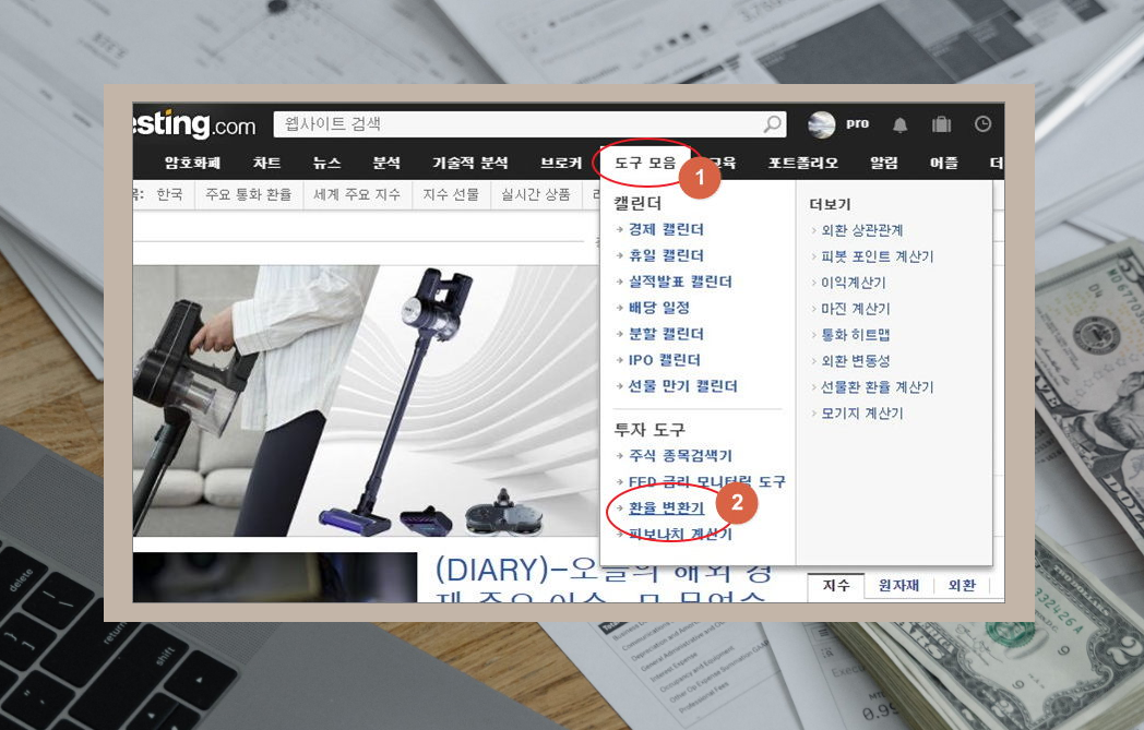 5. 인베스팅에서는 원달러 외에도 다양한 통화에 대한 실시간조회가 가능합니다. 더 나아가 환율 변환기를 사용할 수도 있습니다. 자신이 보유하고 있는 또는 거래하려고 하는 통화의 액수를 입력하면 그에 대한 원화나 다른 통화로 쉽게 변환할 수 있습니다. 메뉴에서 도구 모음을 클릭하면 투자 도구 카테고리에서 변환기 서비스를 찾을 수 있습니다.