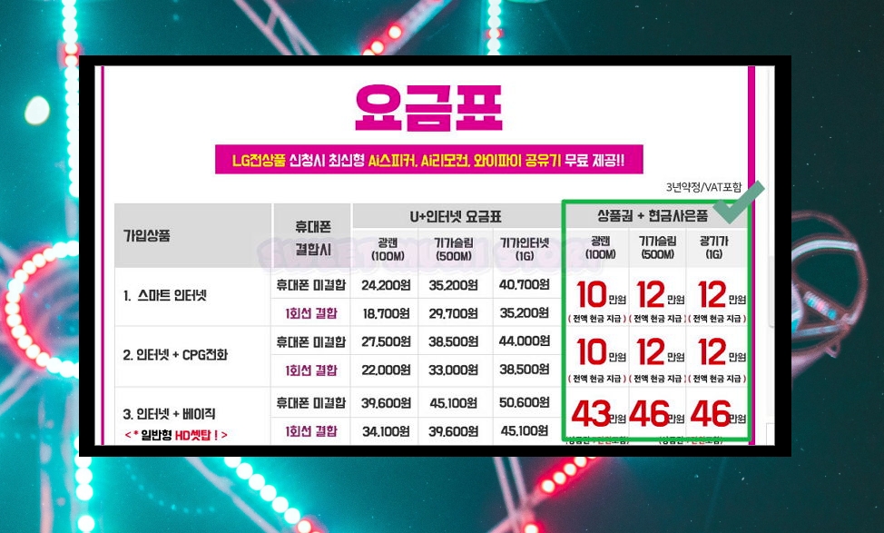 LG의 경우에는 AI스피커, AI리모콘, 와이파이 공유기를 무료로 제공하고 있네요. 이런 식으로 사이트에서 찾아볼 수 있는 여러 통신사 그리고 판매처를 직접 비교해보고 결정하면 돼요.