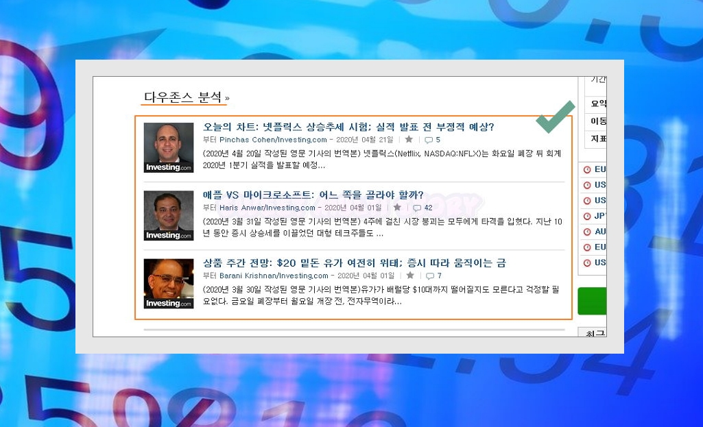8. 뉴스 아래에는 다우존스 지수에 대한 전문가들의 분석 자료를 읽어볼 수 있는데요. 해당 지수를 구성하는 종목에 대한 내용도 포함되어 있어요. 이런 식으로 무료로 유익한 정보를 얻을 수 있어서 좋아요. 잘 활용해 보세요.