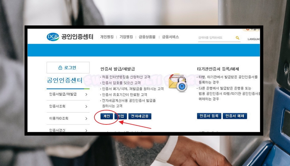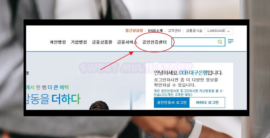 2. 대구은행 영업점에서 가입 신청을 진행한 다음에 사이트에서 해야 할 일이 있어요. 바로 공인인증서를 발급 받는 일인데요. 대구은행 공식 홈페이지에 접속해서 메뉴에 있는 [공인인증센터]를 클릭해 주세요.