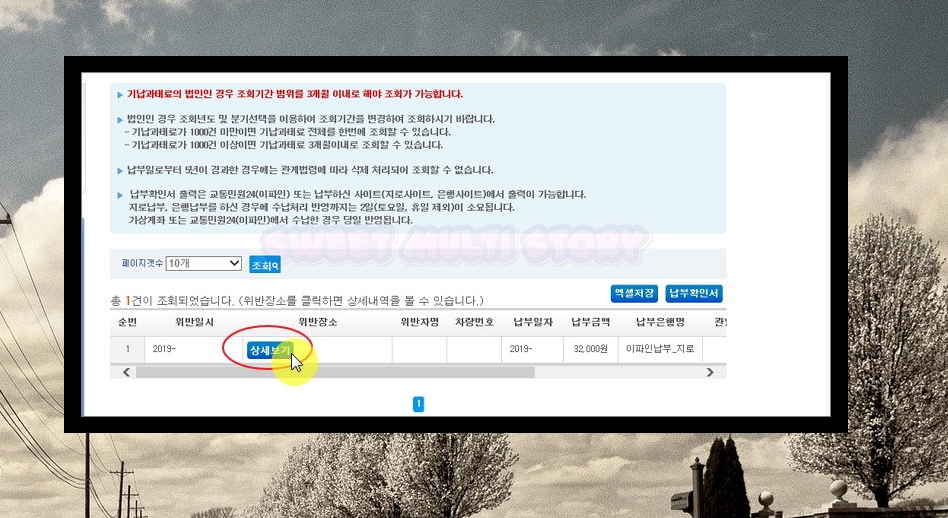 제 경우에는 이전에 교통법규를 준수하지 않았던 적이 있어요. 주정차 관련하여 실수를 했었는데요. 과태료를 납부한 상태이기 때문에 기납 과태료에서 조회가 되네요. 어떤 식으로 교통법규를 위반했는지 자세히 알아보고 싶을 때가 있는데요. 그런 경우에는 [위반 장소]에 있는 [상세보기]를 클릭하면 돼요.