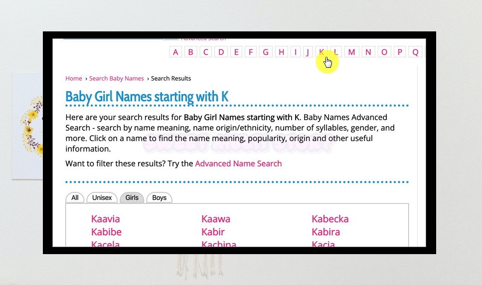 4. 사이트 상단을 보면 알파벳을 선택할 수 있게 되어 있어요. 여자 아이의 이름의 첫 알파벳을 지정하고 싶을 때 사용하면 돼요. k를 선택하니 kaavia, kaawa, kabecka, kabibe, kabir, kabira 등이 나오네요. 추천해주는 양이 많기 때문에 이중에서 마음에 드는 것을 골라서 사용하면 돼요.