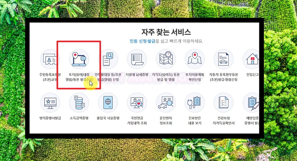 자주 찾는 서비스에서 '토지(임야)대장 열람 및 등본 발급신청' 버튼을 눌러 주세요