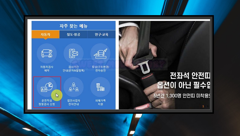 2. 홈페이지 메인화면에 보면 자주 찾는 메뉴가 보일 거에요. 자동차 관련된 여러 서비스가 있는데요. 이중에서 '운전적성 정밀검사 신청'을 클릭하면 사이트에서 예약을 진행할 수 있어요.