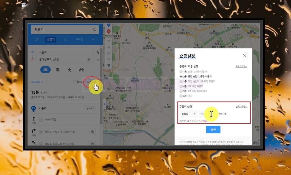 5. 주유비의 경우 차량마다 연비가 다르기 때문에 조절을 해줄 필요가 있어요. 요금 설정 버튼을 누르면 통행료와 차종에 대한 설정이 가능해요. 주유비 설정에서 휘발유, LPG, 경유 중 하나를 선택하고, 연비를 입력해 주세요. 택시요금를 조회하면서 자가용을 이용했을 때 얼마나 나올지 함께 확인할 때 유용해요.