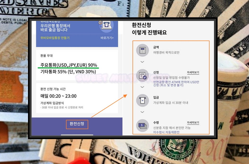 해당 은행의 통장을 보유하고 있다면 바로 출금도 가능한데요. 환율 우대를 보면 USD, JPT, EUR에 대하여 90% 우대를 받을 수 있다고 나와 있어요. 환전수수료 제일 싼 은행을 찾으시는 분에게 적합해요. 하지만 조건이 있어요. 여행경비 목적으로만 환전을 할 수 있다는 점이에요. 실제로 여행을 하는 경우에 사용하기 좋은 방법이에요.