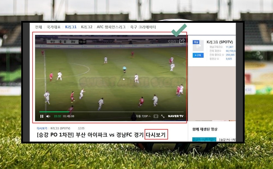 6. 축구중계방송 다시보기 영상을 재생해 보았어요. 이렇게 고화질로 방송을 볼 수 있어요. 소리나 화면을 조절할 수 있으니 자신의 취향에 맞게 설정해 보세요.