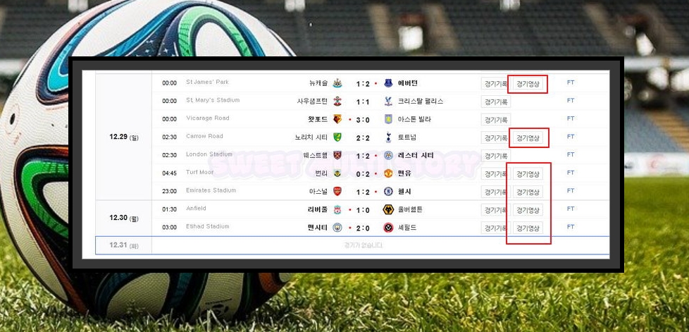4. 화면을 내려보면 좀 더 상세하게 나온 일정표를 확인할 수 있어요. 이렇게 과거 축구 시합에 대해서는 경기영상 버튼이 활성화되어 있어요. 오늘 경기가 있었다면 해당 버튼이 TV중계 버튼으로 바뀌어 있고요. 해당 버튼을 누르면 실시간으로 중계방송을 볼 수 있죠.
