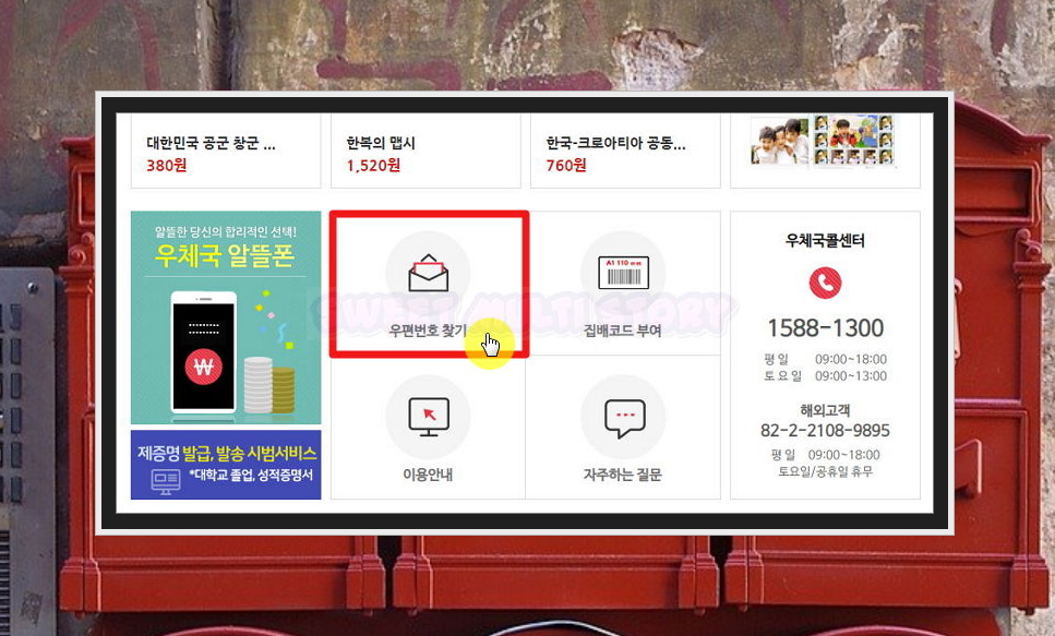 이번에 우리가 이용할 서비스는 '우편번호 찾기' 입니다. 해당 서비스를 통해 우편번호 검색은 물론이고, 도로명주소 찾기를 할 수 있죠. 특정 장소에 대한 주소를 일부만 알고 있어도 검색을 통해 쉽게 알아낼 수 있어요.