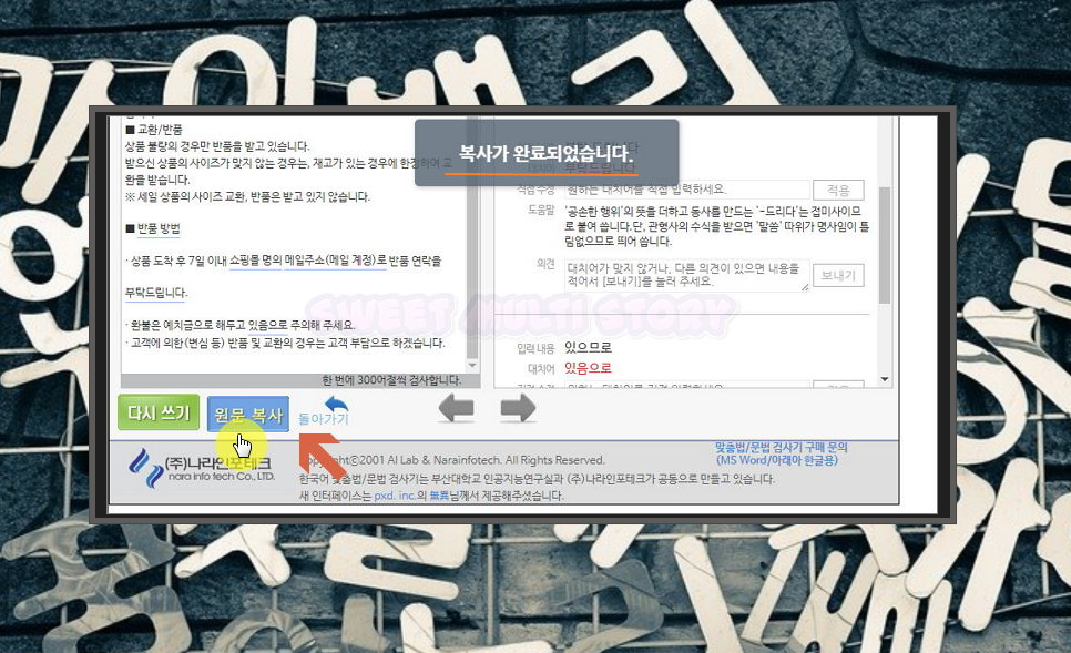 5. 해당 버튼을 누르면 그럼 한글 맞춤법에 맞는 문장을 얻을 수 있습니다. 클립보드에 복사가 되었기 때문에 다른 곳에 붙여 넣어야 하는데요. 메모장이나 아래아 한글, 마이크로소프트 워드 프로그램 등에서 컨트롤과 V 버튼을 누르면 붙여 넣기가 됩니다.