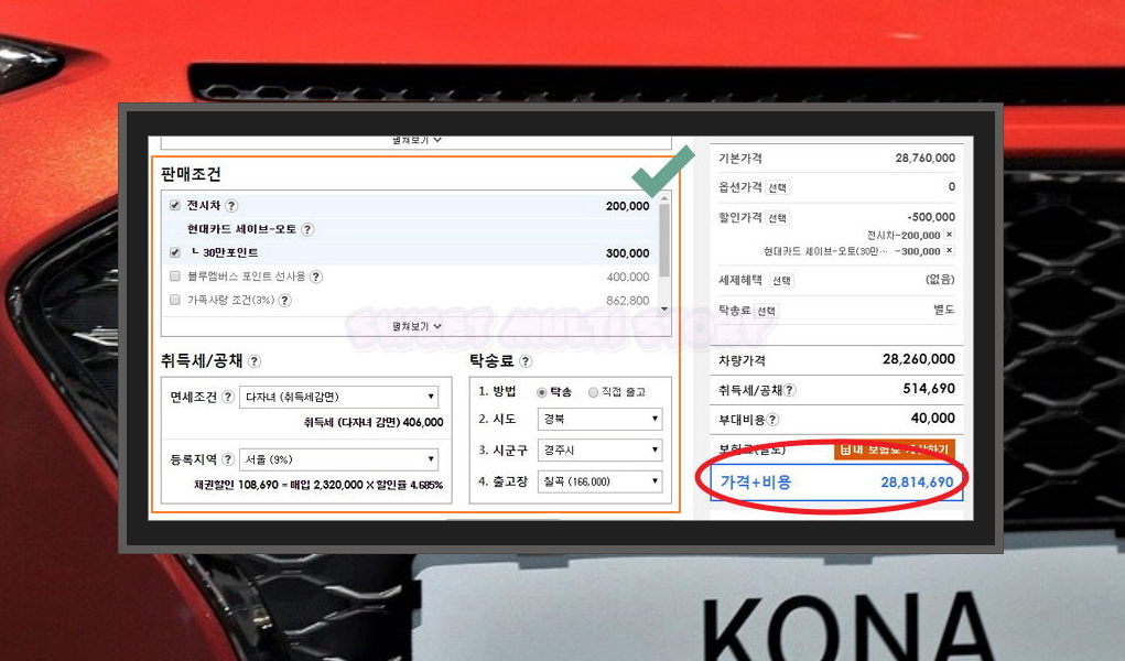 8. 앞에서 확인했던 판매조건도 선택이 가능한데요. 자신이 받을 수 있는 부분을 체크해 보세요. 그럼 해당 내용이 전체 금액에 자동으로 추가됩니다. 취득세, 공채, 탁송료도 자동차를 구매할 때 발생하는 비용이에요. 면세조건, 등록지역, 출고장 등을 지정하시면 관련 비용이 산출됩니다.
