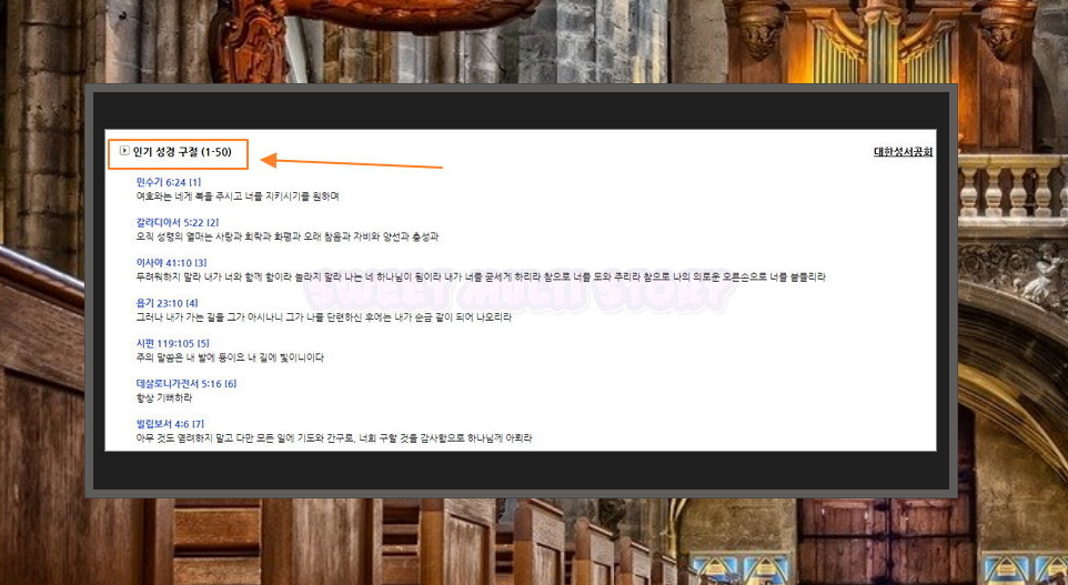 5. 인기 성경구절 모음 서비스는 좋은 문장 중에서도 사람들이 많이 찾는 것만 따로 모은 것인데요. 50개의 구절로 구성되어 있습니다. 만수기, 갈라디아서, 이사야, 욥기, 시편, 데살로니가전서, 빌립보서, 요한복음, 마태복음, 요한복음 등에 있는 좋은 성경구절을 찾아볼 수 있습니다.