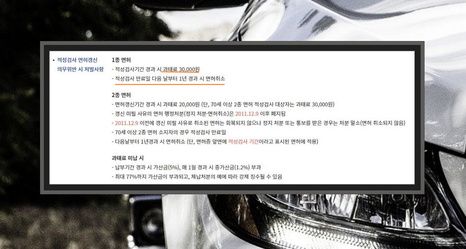 운전면허 적성검사 기간을 경과했을 경우 과태료가 발생합니다. 3만원이라는 큰 금액인데요. 준비물을 설명할 때 말씀 드린 수수료보다 많은 금액입니다. 가급적 늦지 않게 검사를 받으시는 것이 좋고요. 검사 만료일 다음 날로부터 1년이 경과한 경우에는 면허가 취소가 됩니다. 차량 운행을 자주하시는 분이라면 필히 주의하시길 바랍니다.