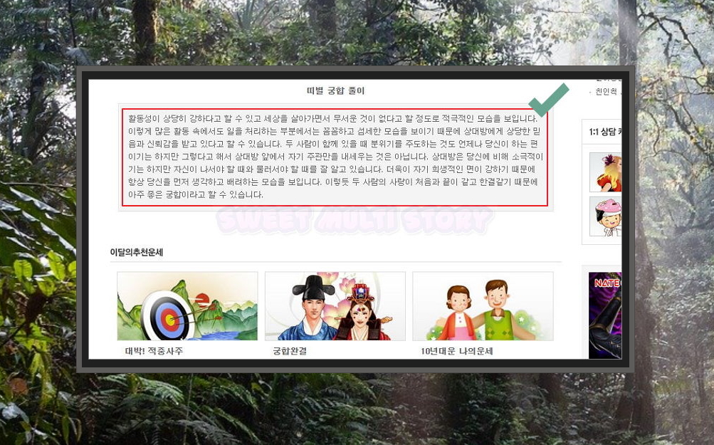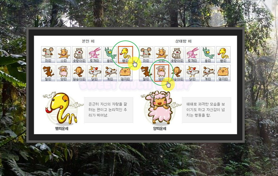 4. 본인과 상대에게 해당하는 것을 선택하면 둘 사이의 궁합 풀이를 읽을 수 있습니다. 풀이에서 보시면 뱀과 양은 처음과 끝이 같고 한결같기 때문에 아주 좋은 궁합이라네요. 이런 식으로 여러 가지를 하나씩 선택하면서 서로의 궁합을 확인해 보시면 좋습니다.