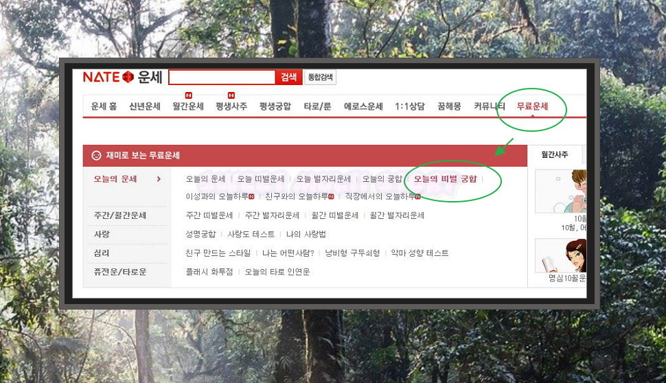 2. 사이트에 접속하면 신년운세, 월간운세, 평생사주, 평생궁합 등 다양한 운세 서비스가 메뉴에 나타나는데요. 대부분 유료 입니다. 메뉴에서 가장 우측에 있는 무료운세를 클릭해 보세요. 그럼 무료로 이용할 수 있는 오늘의 궁합을 찾으실 수 있습니다.