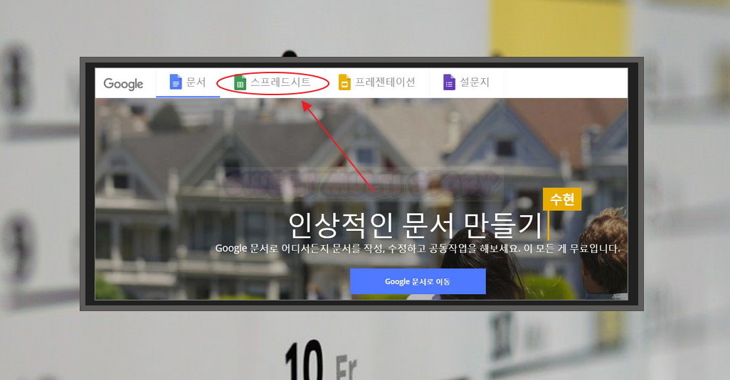 2. 스마트폰을 사용하는 분이라면 구글 계정 하나 정도는 가지고 있으실 거에요. 구글 문서 사이트에서 로그인을 한 후 메뉴에 있는 스프레드시트를 클릭해 주세요. 스트레드시트는 마이크로소프트의 엑셀 프로그램과 같다고 보시면 돼요. 비용이 발생하지 않고, 인터넷이 되는 곳이라면 어디서든 이용할 수 있다는 장점이 있죠.