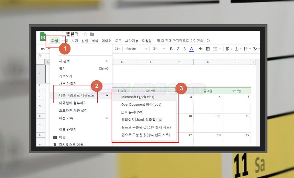 6. 메뉴에서 파일을 클릭하면 '다른 이름으로 다운로드'를 찾으실 수 있을 거에요. 클릭해 보면 2023년 달력을 Microsoft Excel, ods, PDF 문서, 웹페이지 등으로 다운로드 받으실 수 있어요. 인쇄도 가능하고요.