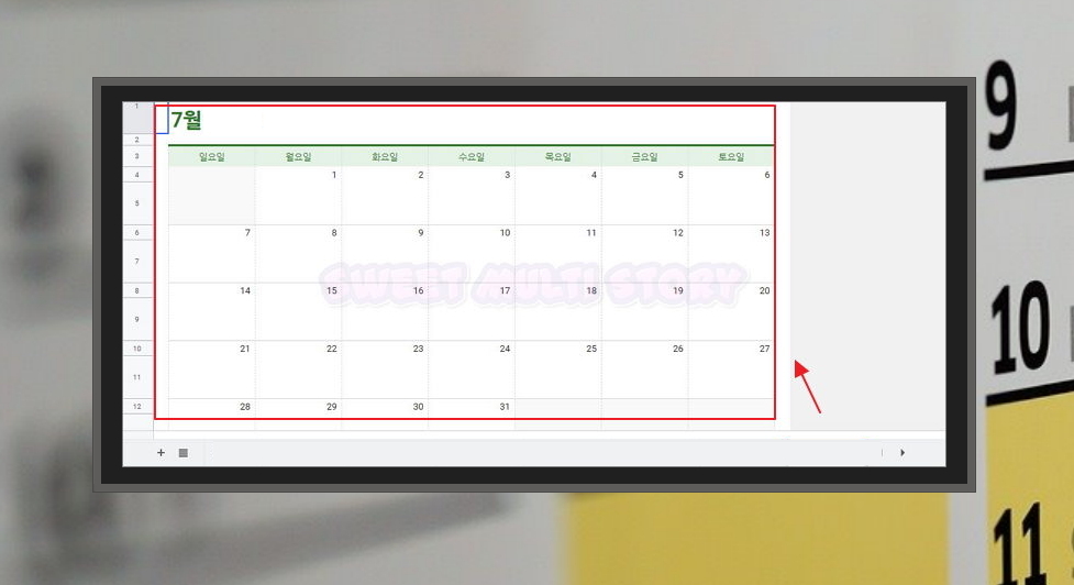 5. 스프레드시트 화면에서 아랫쪽을 보면 탭 버튼이 있어요. 2023년 7월을 클릭해 보세요. 그럼 월 별 캘린더를 확인할 수 있어요. 각 날짜에 메모를 할 수 있어요. 화면에서 짤렸지만, 아랫 부분에 긴 문장으로 메모도 가능해요. 다운로드도 가능한데요. 다음 단계에서 알려 드리죠.