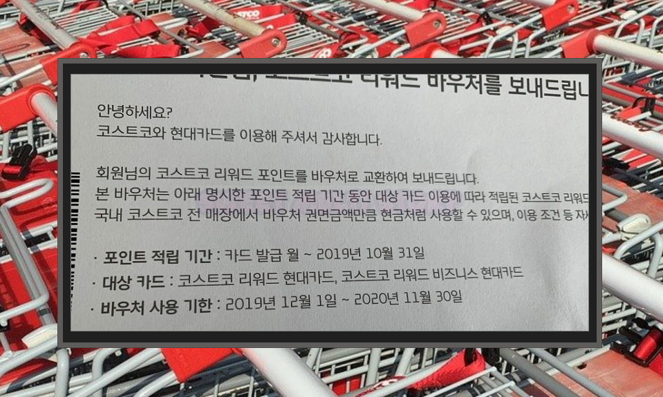 일정기간 동안 코스트코 리워드 현대카드를 사용하면 이렇게 리워드 바우처를 받을 수 있어요. 1년에 한 번씩 받을 수 있는데요. 포인트 적립 기간은 발급한 달부터 다음 연도 10월 31일까지에요. 바우처는 그 다음 연도 11월 30일까지 사용해야 하고요.