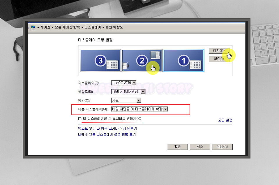 4. 연결이 다 되었다면 컴퓨터를 켜고, 제어판을 실행해 주세요. 설정을 통해 모니터 2개 사용하는법을 알려드릴게요. 제어판에서 디스플레이, 화면 해상도 아이콘을 순서대로 클릭해 주세요. 그럼 디스플레이 모양 변경 창이 떠요. 감지 버튼을 누르면 본체와 연결된 모니터가 나타나요. 제 경우에는 3개가 나타났어요. 그 다음 [다중 디스플레이] 항목에서 [바탕 화면을 이 디스플레이에 확장]으로 지정해 주세요.