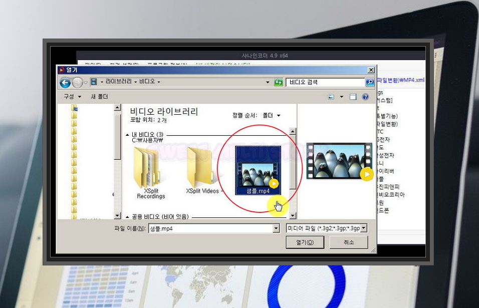 4. 해당 프로그램을 통해 대상이 되는 mp4를 열어야 해요. avi를 mp4로 변환을 하는 경우에는 avi를 선택해야 해야 한다는 점 참고해 주세요. 저는 샘플 동영상 파일을 선택했습니다.
