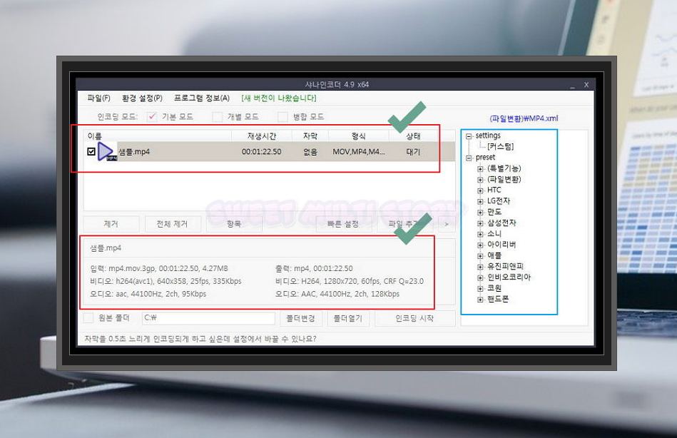 10. 프리셋을 지정하고, 설정까지 하셨다면 인코딩 시작 버튼을 눌러주세요. mp4 파일의 용량에 따라 인코딩 시간이 달라집니다. 용량이 클수록 변환 시간이 길죠.