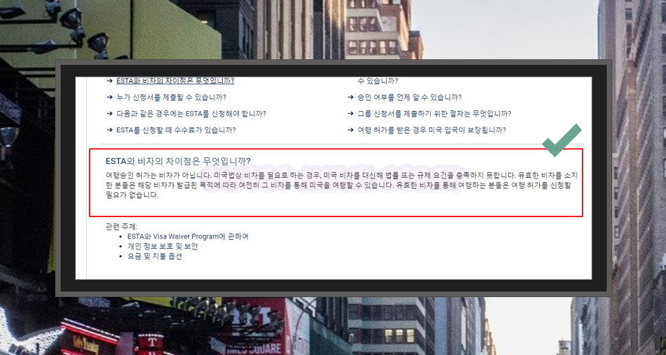 1. 기본적으로 미국 비자를 갖고 계신분들은 esta 전자여권을 만들 필요가 없어요. 두 가지 모두 미국을 방문할 수 있다는 것은 같지만, esta의 경우 비자를 대신하여 법률이나 규제 요건을 충족하지 못해요. 상용이나 관광의 목적으로 방문하는 것이 아니면 비자 신청을 하셔야 해요.