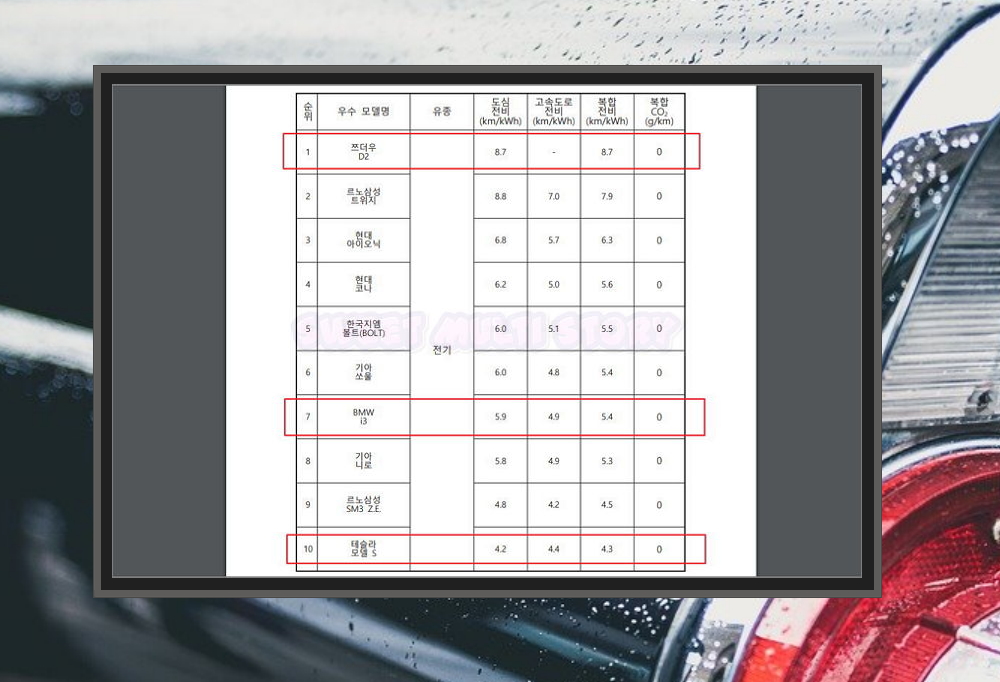 해당 자료는 2019년에 배포 되었기 때문에 2018년 데이터를 가지고 정리가 되어 있어요. 표를 통해 연비 순위 10위 안에 드는 모델을 확인할 수 있어요. 국산차도 섞여 있으니 함께 보시길 바래요. 전기 자동차의 경우에는 kWh 당 km를 가지고 비교하는데요. 쯔더우의 D2, BMW i3, 테슬라 모델 S가 10위 안에 있네요.